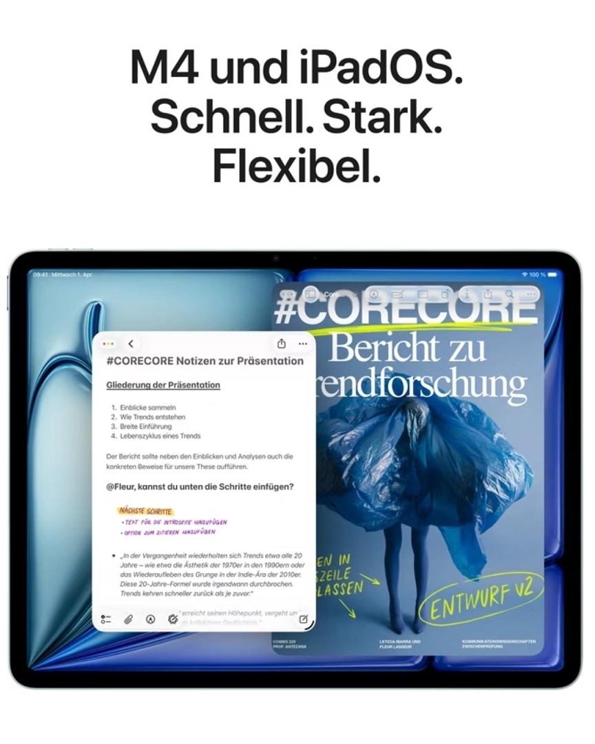 Das 11" iPad Air. Entwickelt für Apple Intelligence. Das iPad Air kommt jetzt mit der Power des Apple M4 Chip. Unglaublich leistungsstark und günstig. Es hat ein beeindruckendes Liquid Retina Display, eine 12MP Center Stage Frontkamera für grossartige Videoanrufe, iPadOS und superschnelles WLAN 7. Und es ist mit dem Apple Pencil Pro, dem Magic Keyboard für das iPad Air und mehr kompatibel. So kannst du ganz einfach mehrere Aufgaben gleichzeitig erledigen, lernen, arbeiten, spielen und kreativ sein.