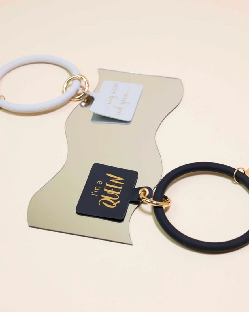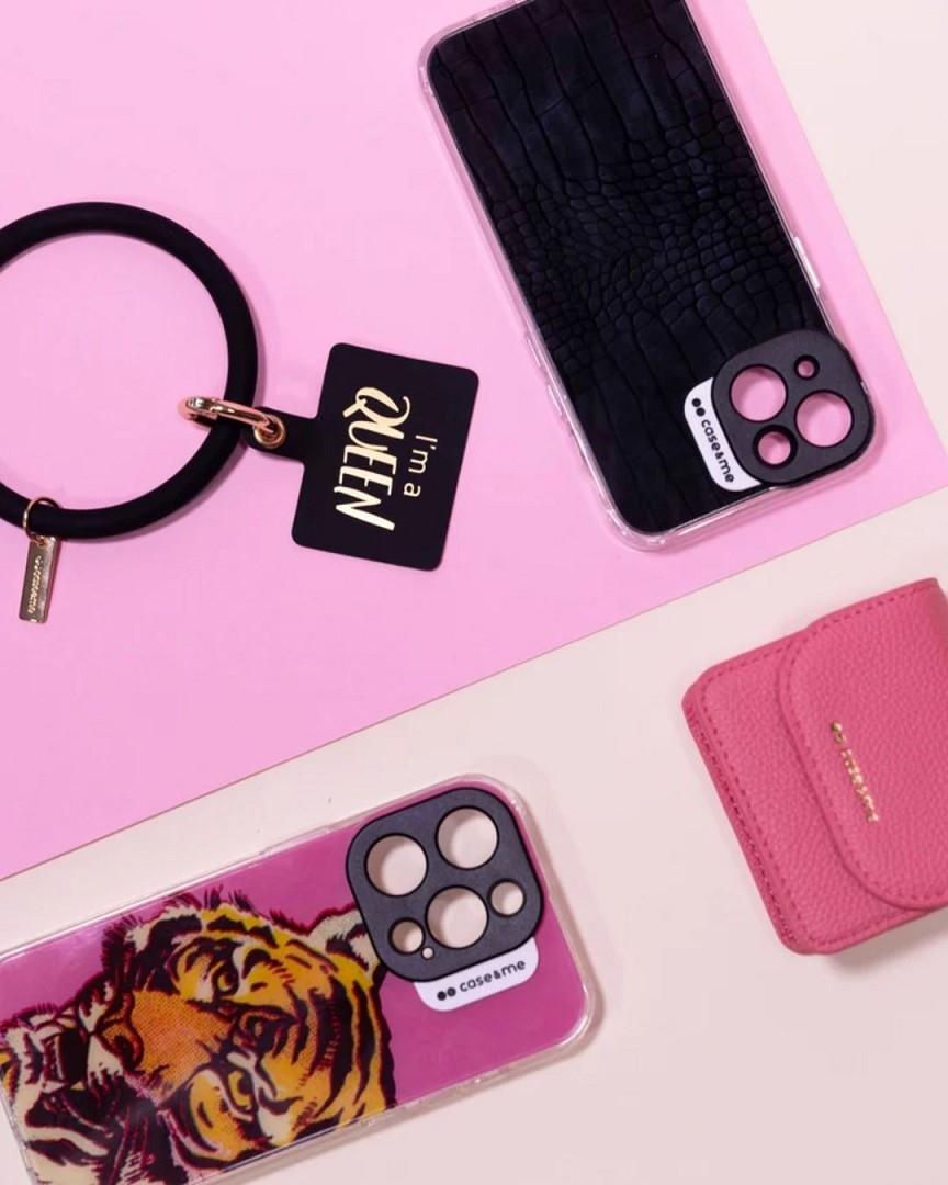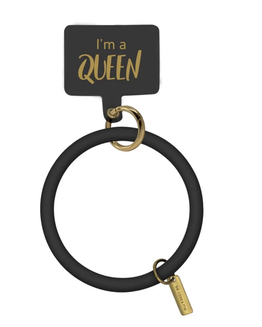 I'm a Queen"-Anhänger, der zwischen Handy und Hülle angebracht wird, indem die perforierte Lasche aus der Öffnung für die Smartphone-Ladebuchse gezogen wird. Befestigen Sie dann den goldfarbenen Ring an der Aussparung der Lasche.