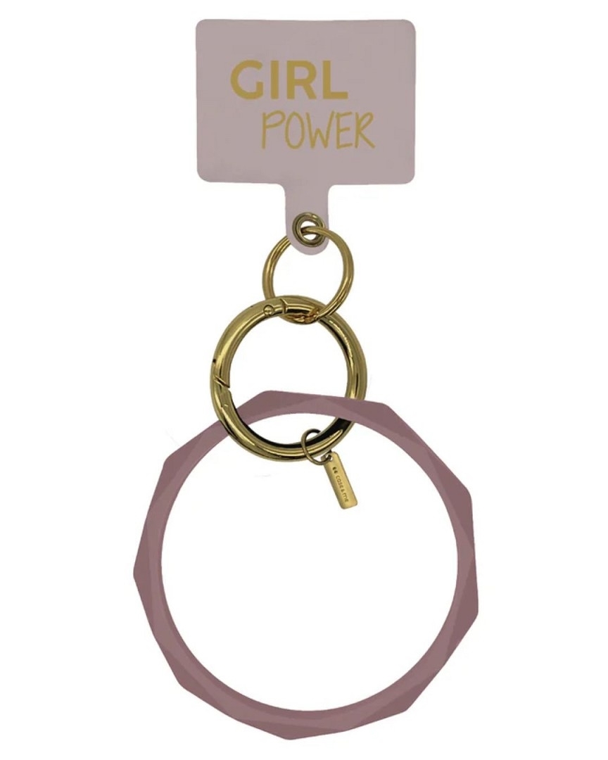 "Girl Power"-Anhänger, der zwischen Handy und Hülle angebracht wird, indem die perforierte Lasche aus der Öffnung für die Smartphone-Ladebuchse gezogen wird. Befestigen Sie dann den goldfarbenen Ring an der Aussparung der Lasche.