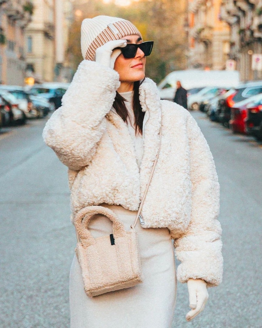 Die Tasche ist mit einem weichen Teddyfellimitat überzogen, das ihr eine typisch winterliche Eleganz verleiht. Kombinieren Sie sie mit Ihren besten Outfits und nehmen Sie sie mit in die Berge, zu Silvester, zum Skifahren oder zum Einkaufen an Winternachmittagen.