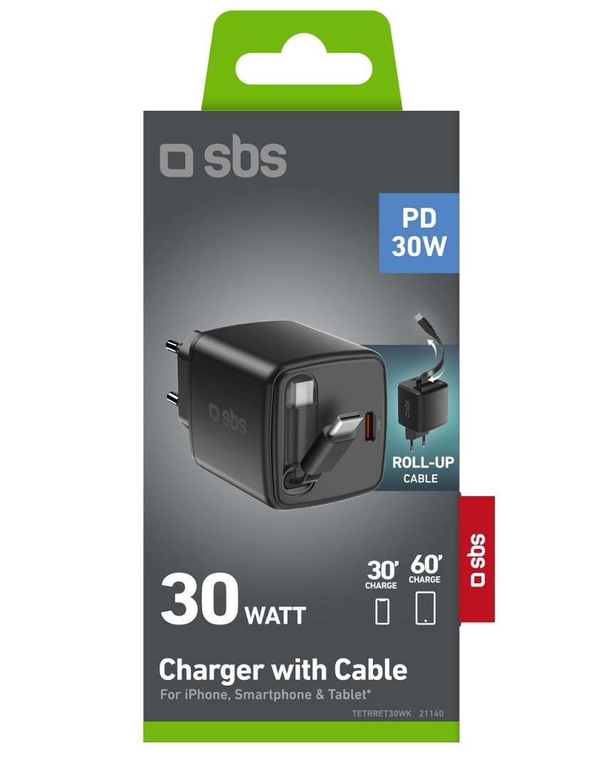 SBS GaN-USB-C-30-W-Ladegerät mit einziehbarem Kabel (schwarz)