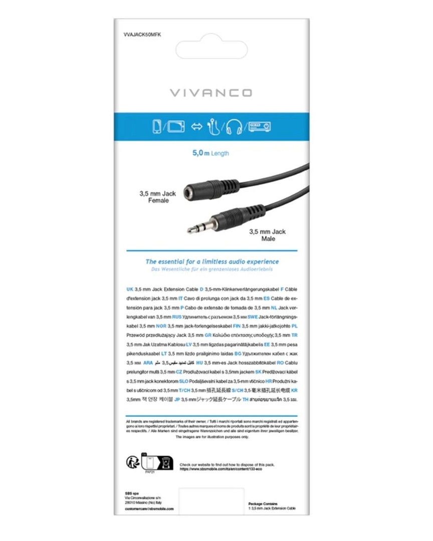 Mit diesem Vivanco-Kabel können Sie Ihr Smartphone und Ihren PC mit Kopfhörern, Ohrhörern und anderen 3,5-mm-Klinkenkabeln verbinden, die ein längeres Kabel benötigen. Mit einer Länge von 1,5 m garantiert es eine hervorragende Audioqualität. Das Kabel verfügt über einen Knickschutz, sodass Sie dieses Zubehör auch auf engstem Raum verwenden können, ohne das Kabel zu beschädigen. Eigenschaften: