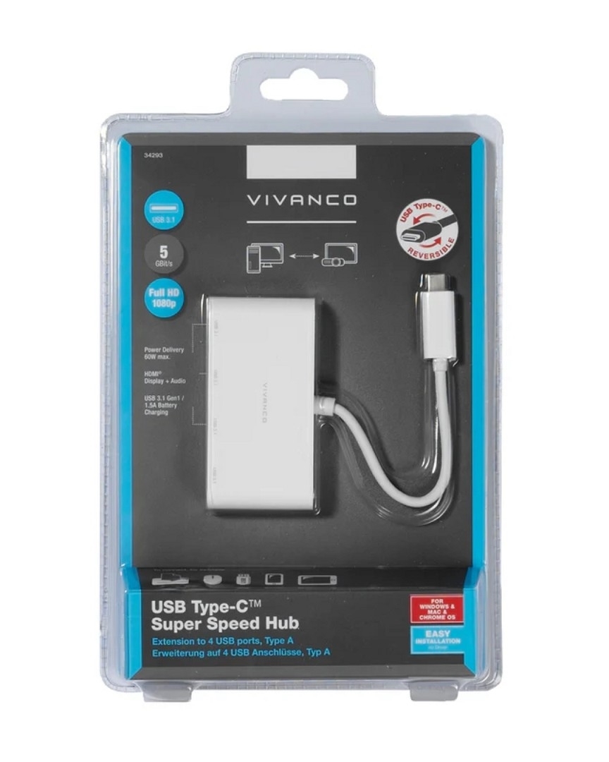 USB-C-Hub für den gleichzeitigen Anschluss von bis zu 4 Geräten. Ideal für Geräte mit USB-3.1-Standard.
