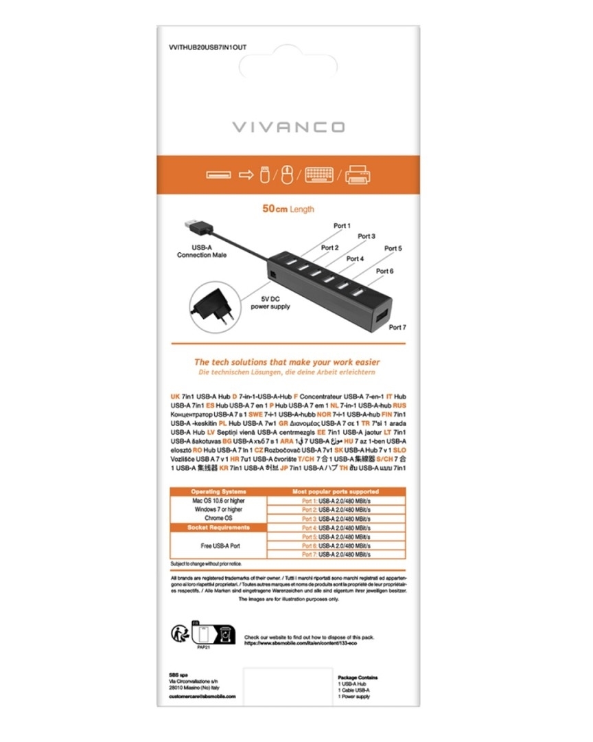 Dieser Multiport-Adapter verfügt über 7 USB 2.0-Anschlüsse für den Anschluss von Peripheriegeräten wie Mäusen, Druckern und Tastaturen. Auch USB-Sticks und andere Geräte mit USB-Stecker sind kompatibel.