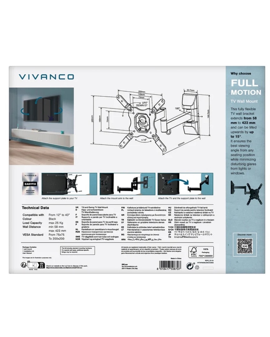 Die Vivanco Wandhalterung ist die ideale Lösung für die sichere Befestigung von Flachbildfernsehern bis 43 Zoll (bis zu 25 kg) mit VESA bis 200 x 200. Die Metallkonstruktion sorgt für Stabilität und Langlebigkeit.